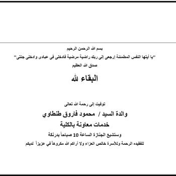 يتقدم الأستاذ الدكتور/ علاء عبد الحفيظ عميد الكلية، ووكلاء الكلية، ورؤساء الأقسام العلمية وأعضاء هيئة التدريس بالكلية ومعاونوهم بخالص التهنئة للدكتور/ أحمد حمدي، بقسم إدارة الأعمال، لحصوله على…