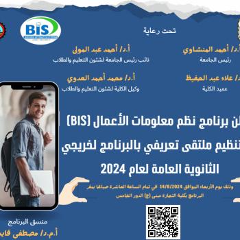 تتشرف إدارة برنامج نظم معلومات الأعمال BIS بكلية التجارة جامعة اسيوط بدعوة خريجي الثانوية العامة المصرية والشهادات المعادلة لعام ٢٠٢٣ - ٢٠٢٤ وذويهم لزيارة مقر البرنامج بمبنى ج بكلية التجارة ( مبنى…
