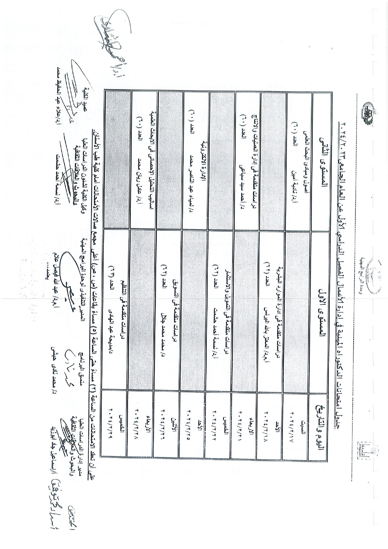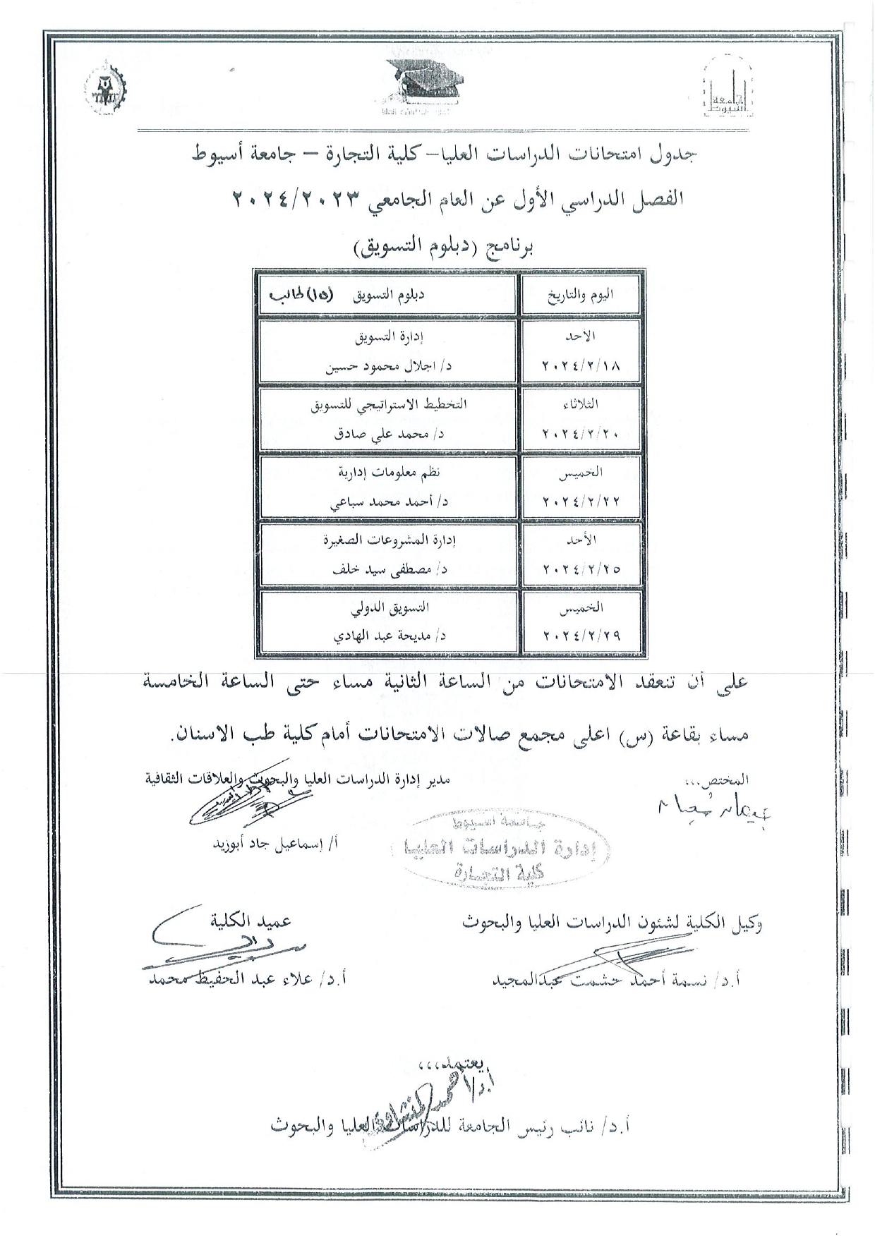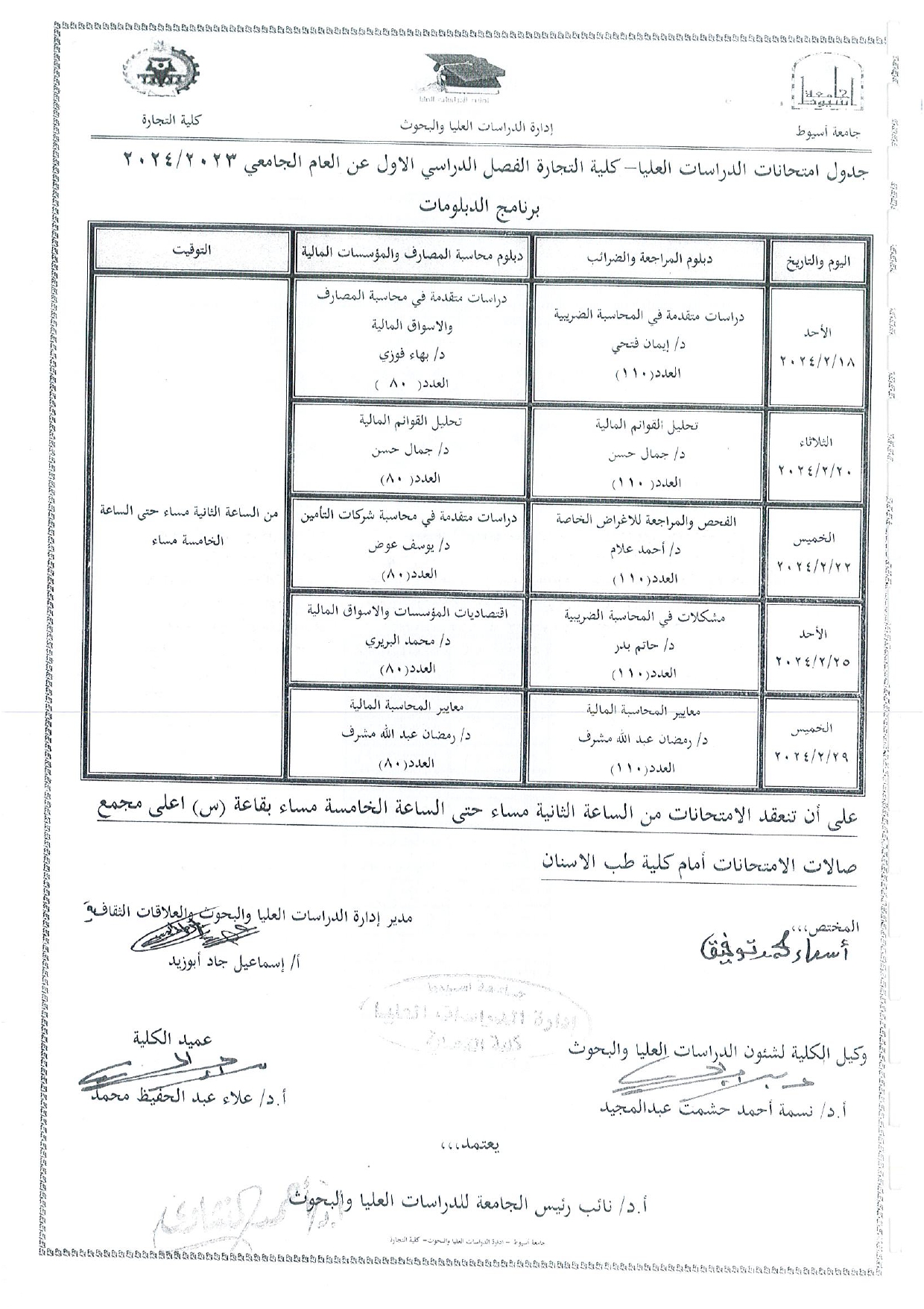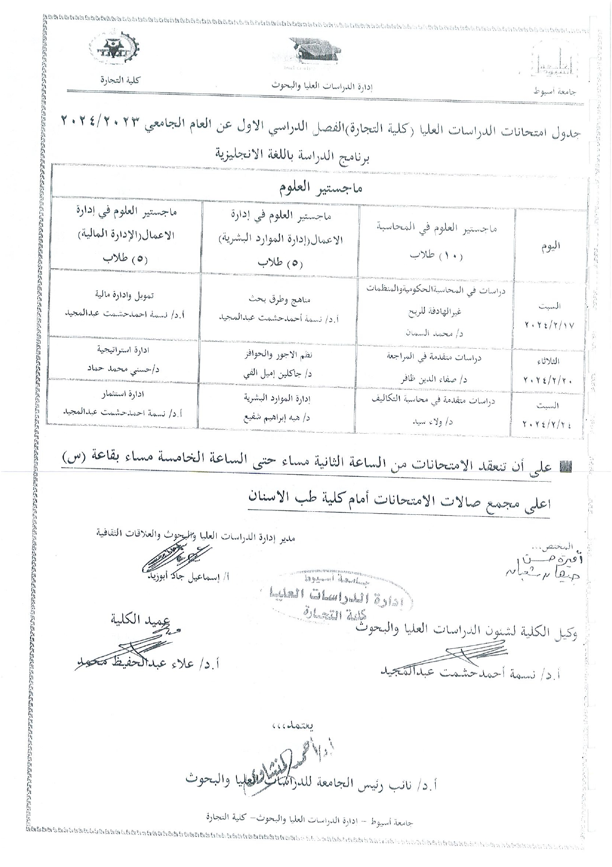 جدول امتحانات الدراسات العليا الفصل الدراسى الاول عن العام الجامعى 2023/2024