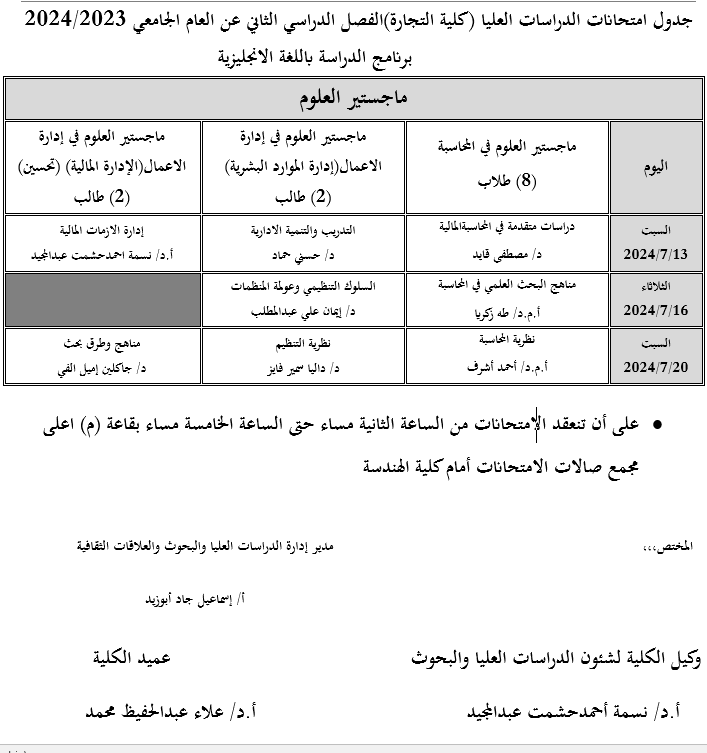 جدول إمتحانات الدراسات العليا ماجستير