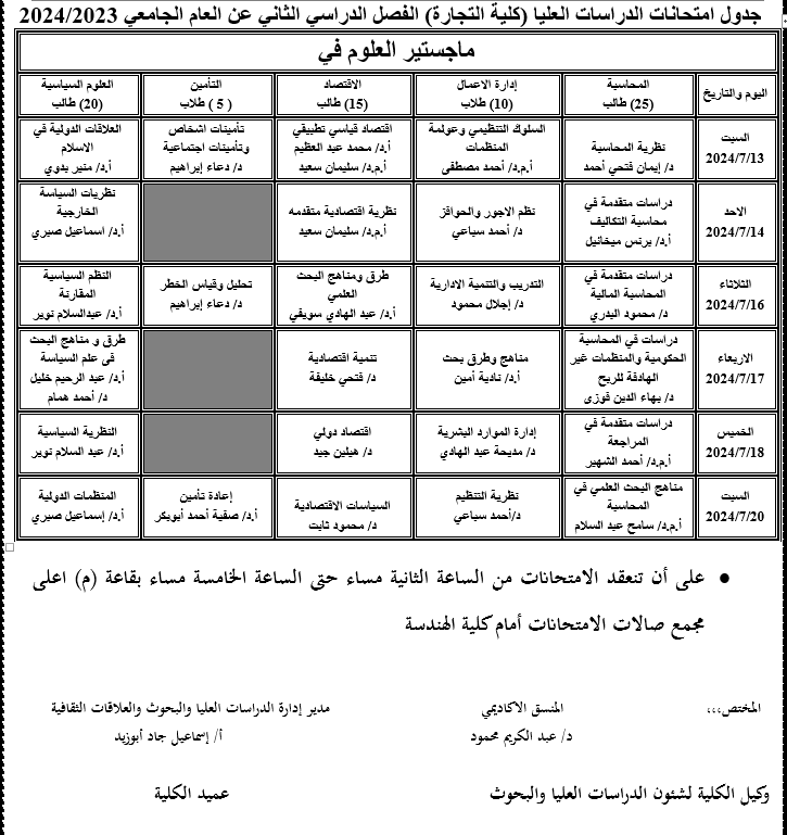 جدول امتحانات الدراسات العليا الفصل الدراسى الثانى عن العام الجامعى 2023/2024