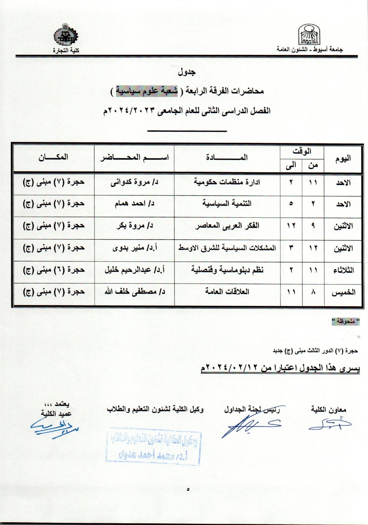 جدول محاضرات الفرقة الرابعة (شعبة علوم سياسية)