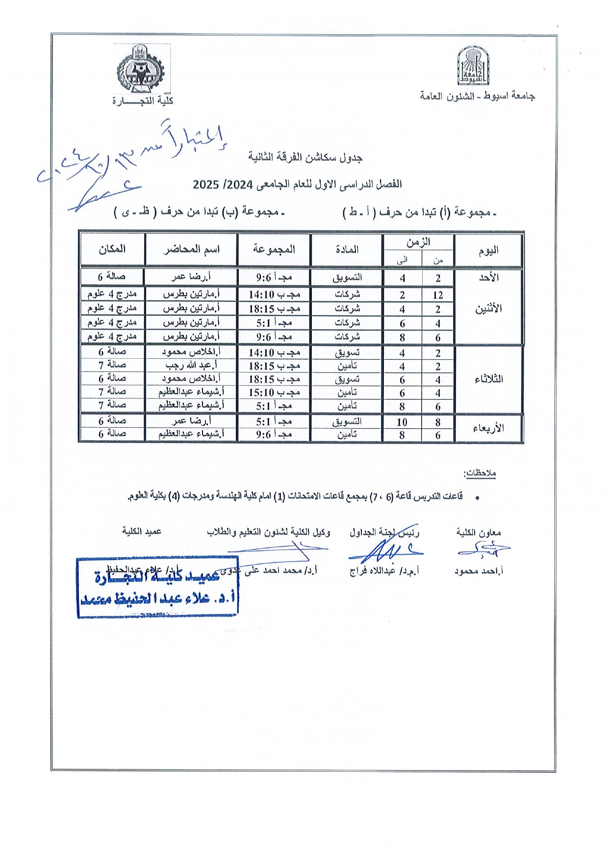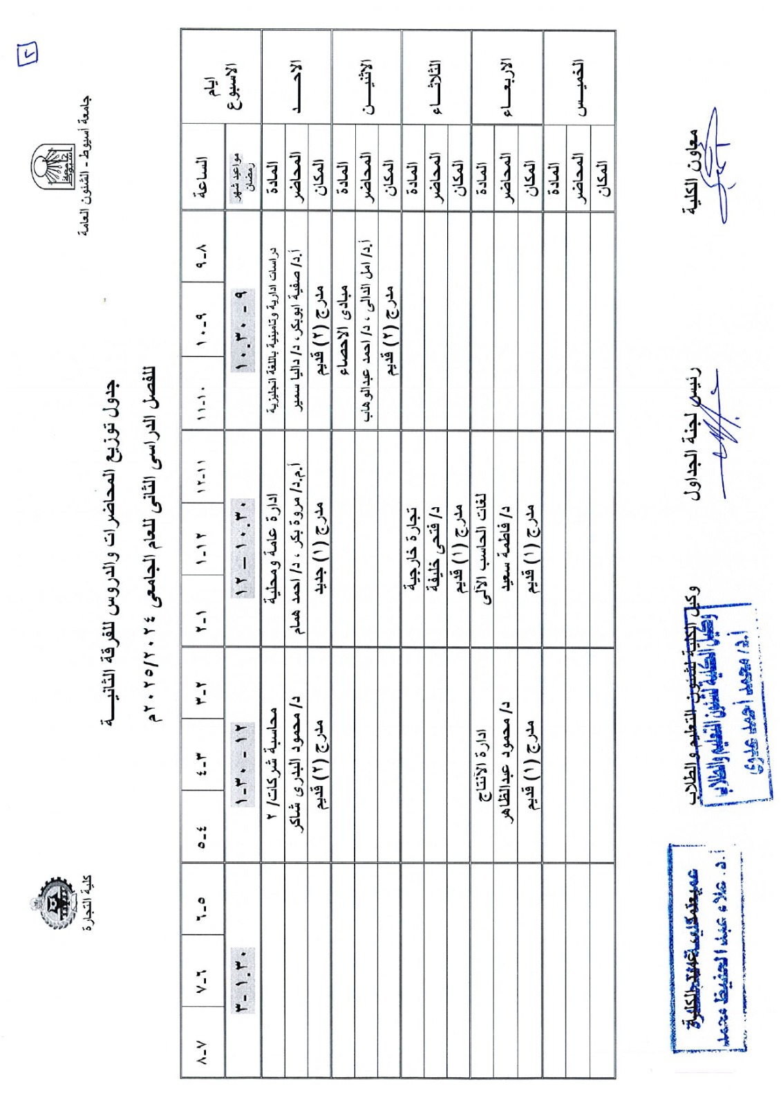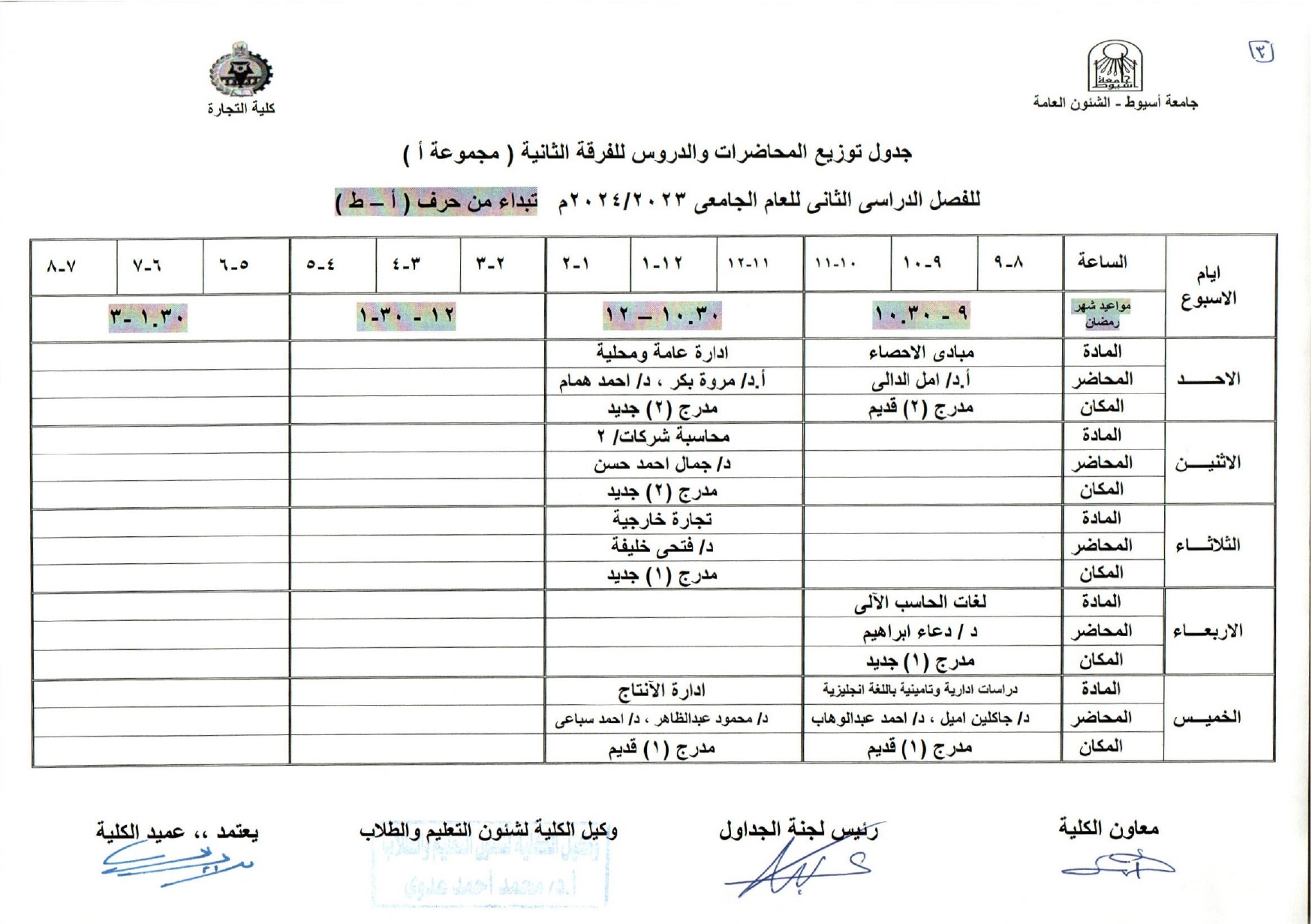 جدول محاضرات الفرقة الثانية مجموعة (ا)