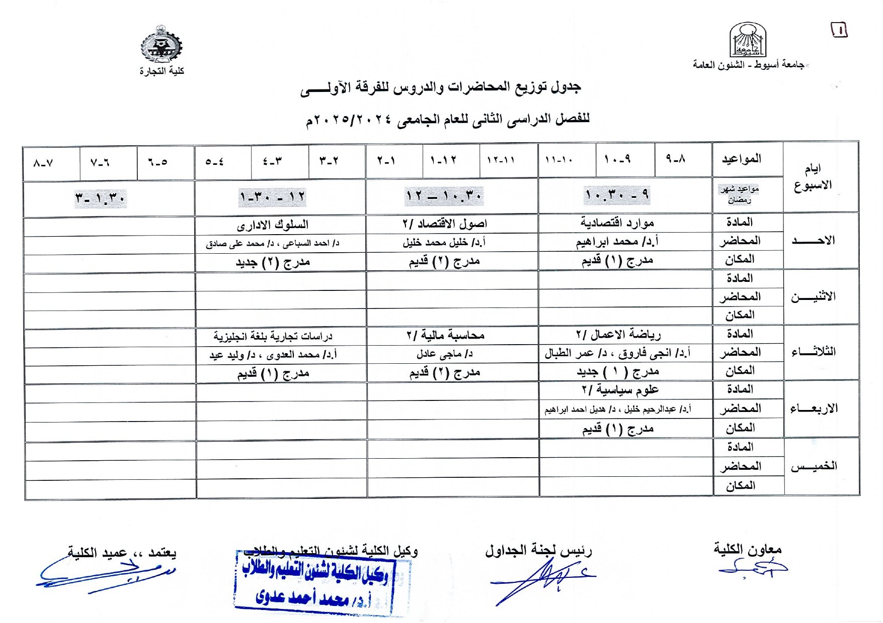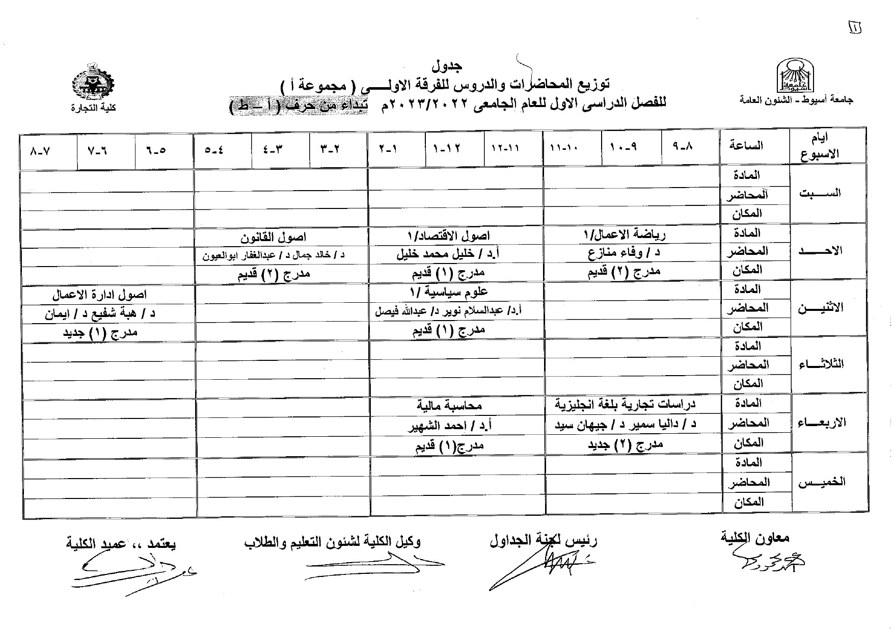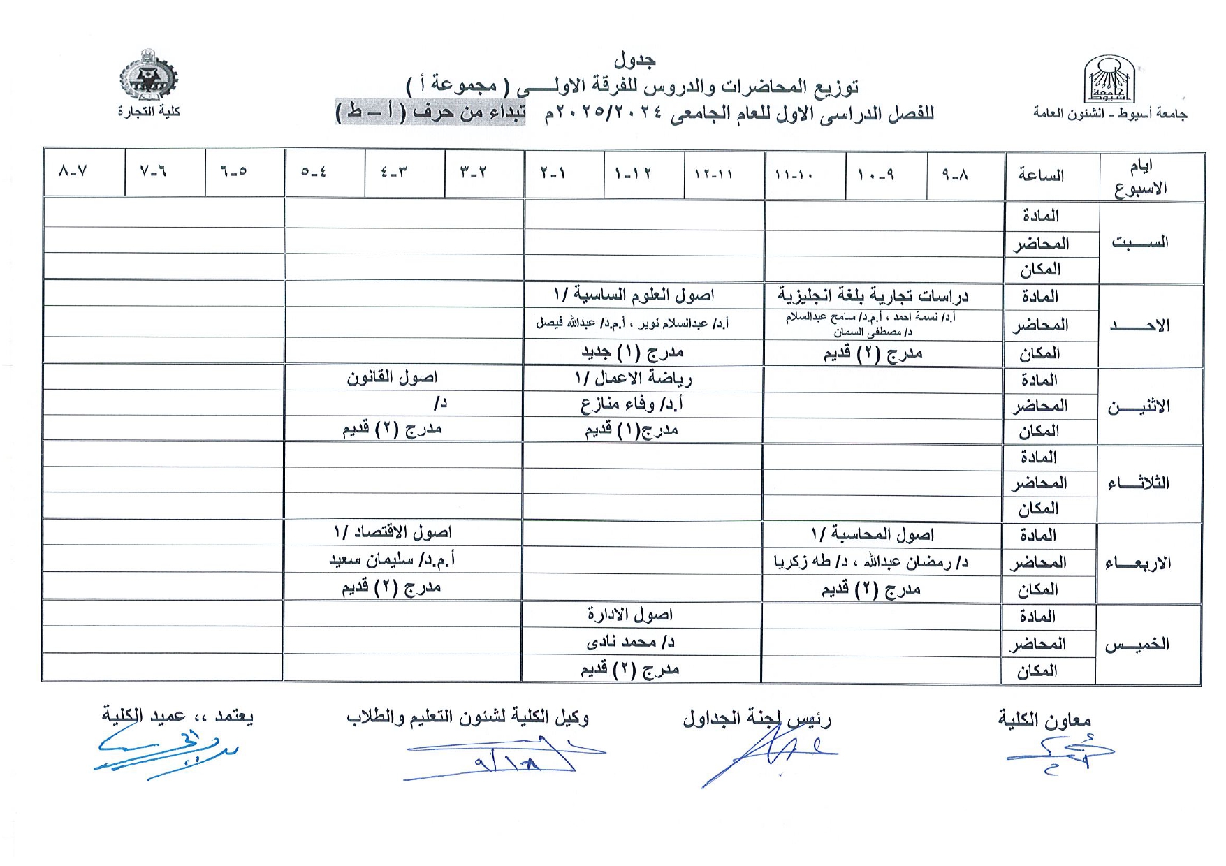 جدول محاضرات الفرقة الأولى مجموعة (ا)