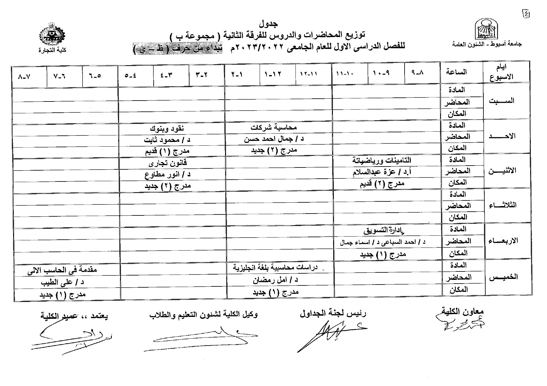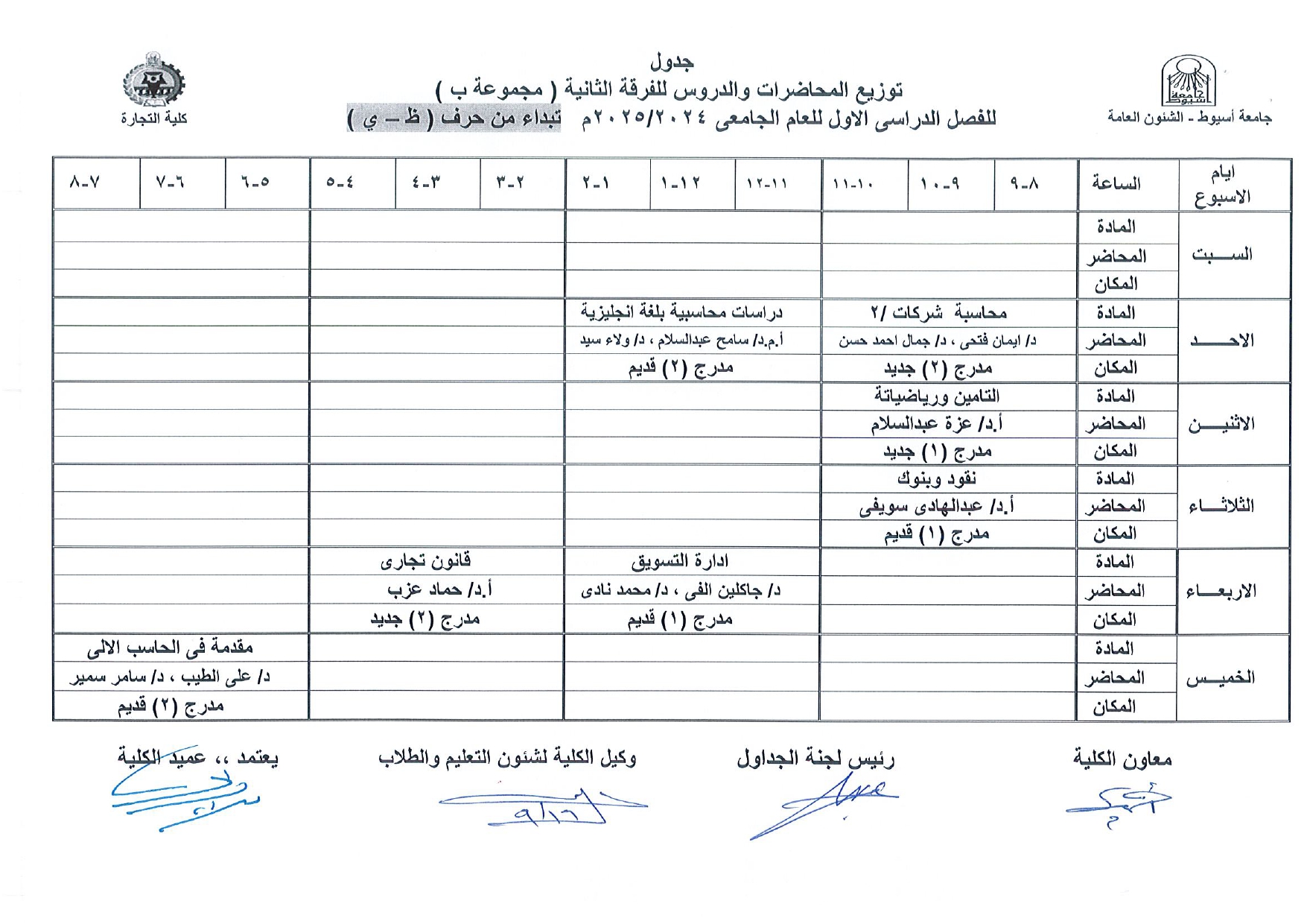 جدول محاضرات الفرقة الثانية مجموعة (ب)