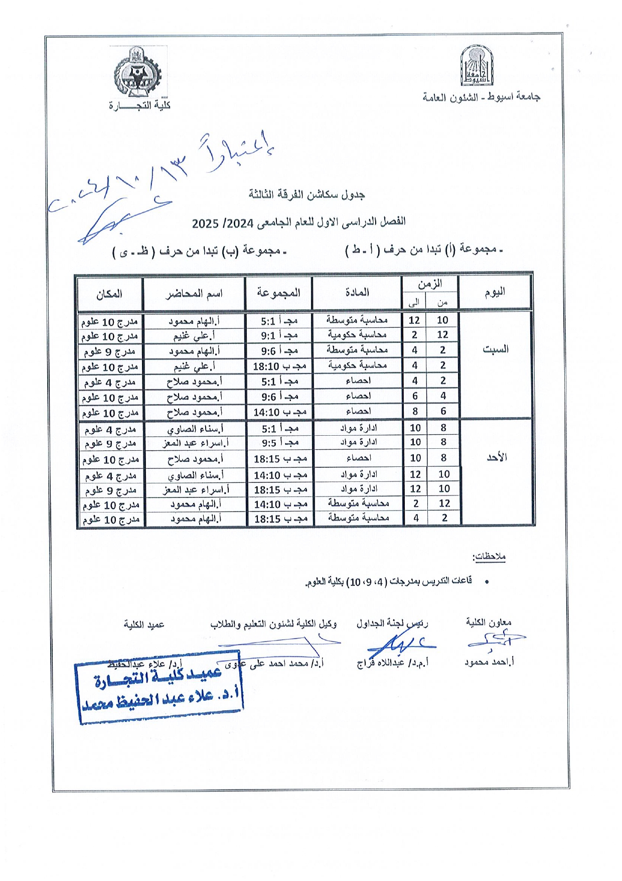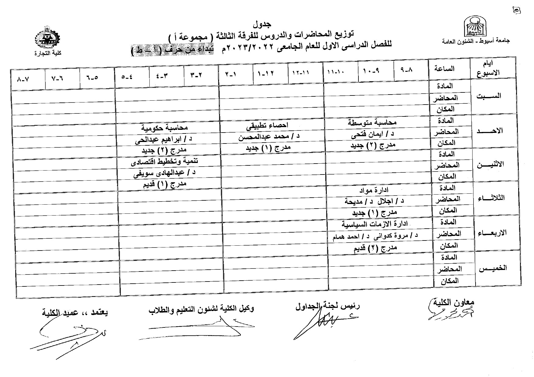 جدول محاضرات الفرقة الثالثة مجموعة (ا)