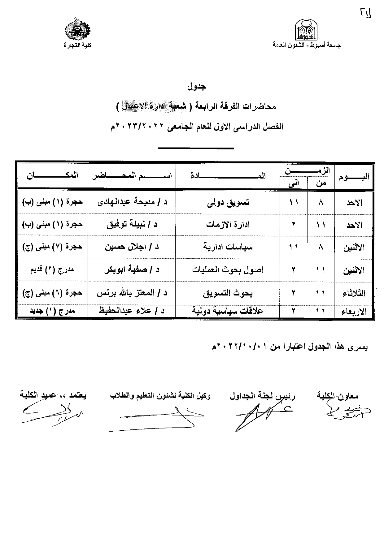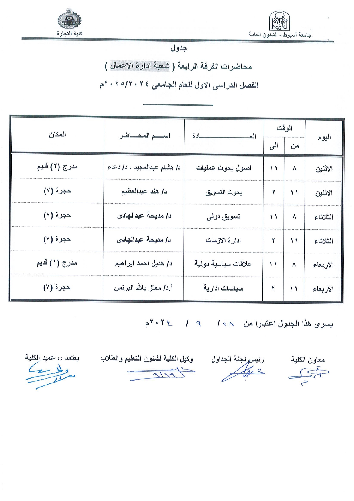 جدول محاضرات الفرقة الرابعة (شعبة إدارة اعمال)