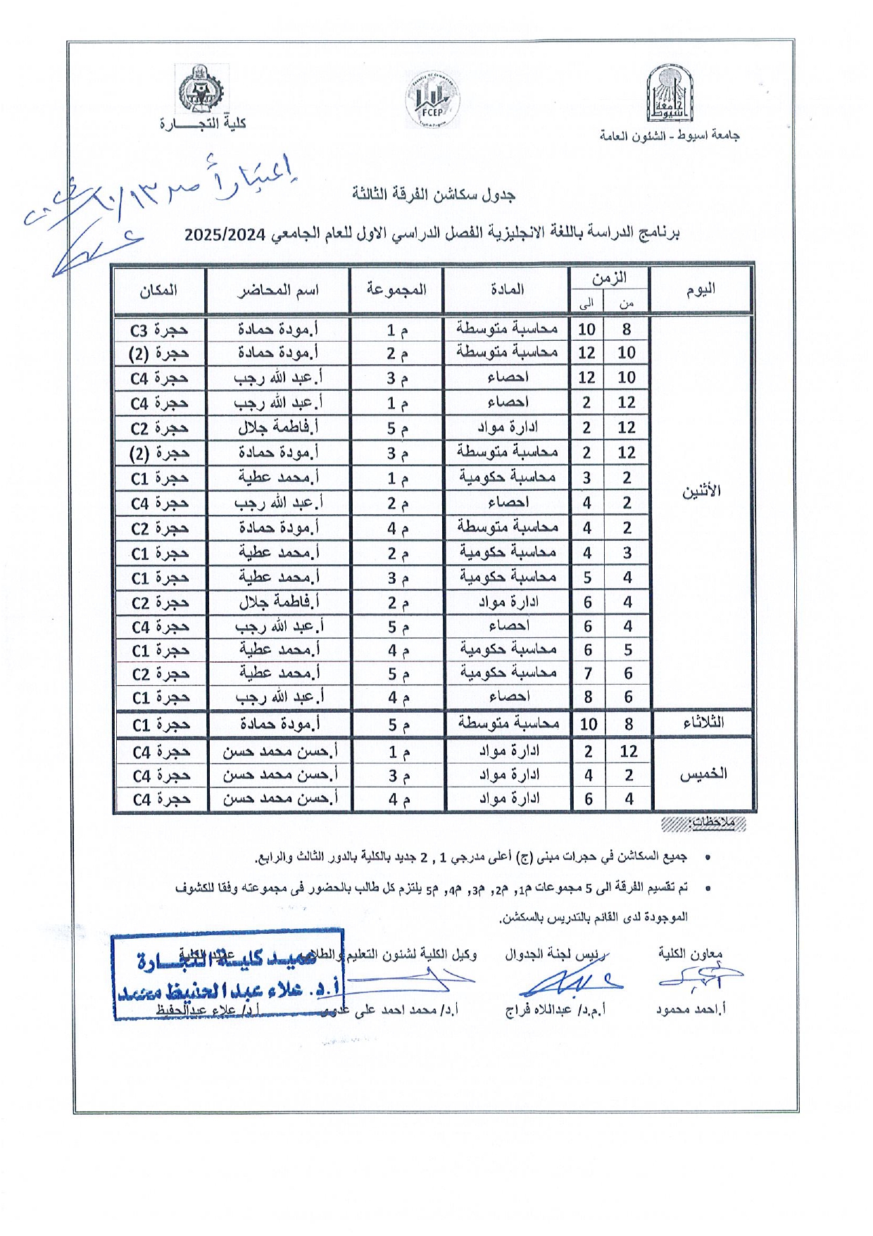 جدول سكاشن الفرقة الثالثة (برنامج الدراسة باللغة الانجليزية)