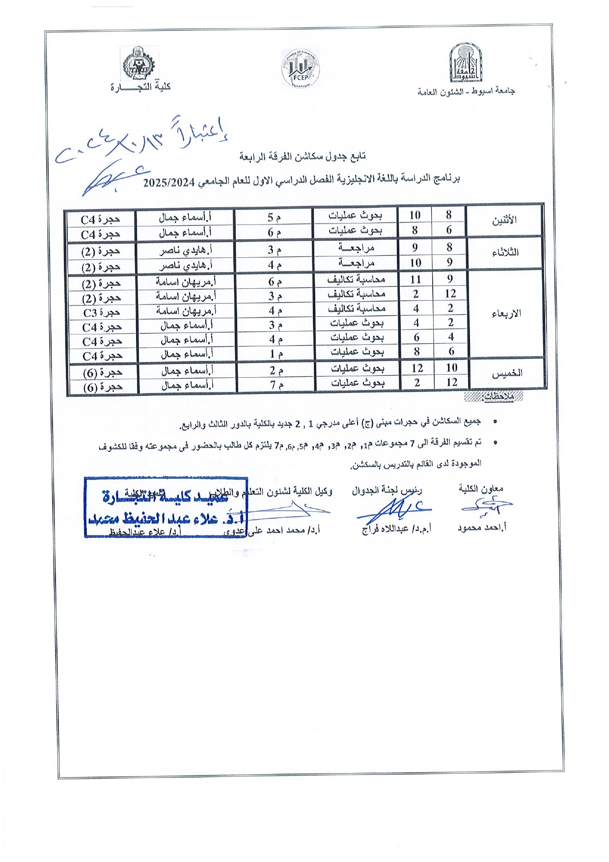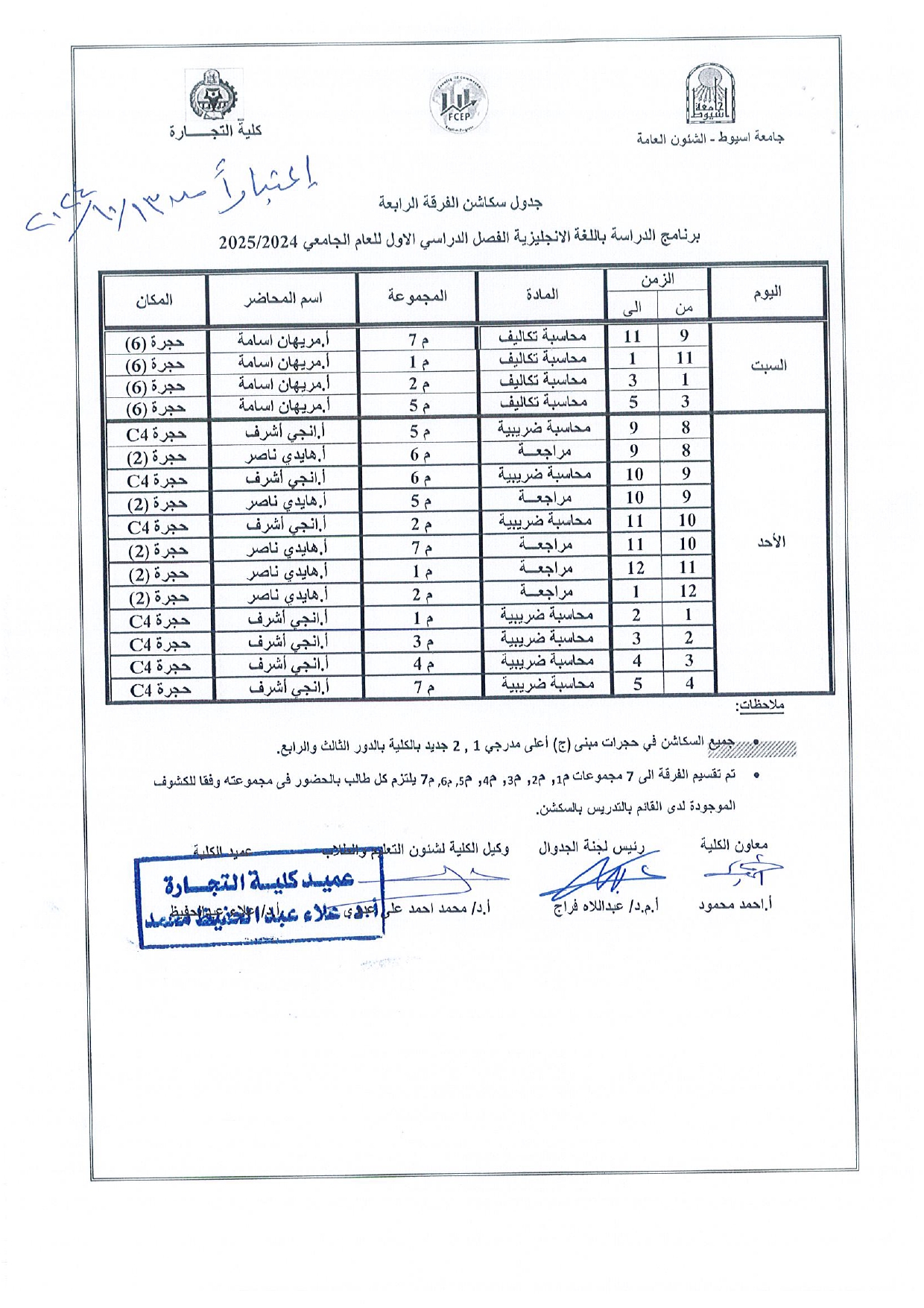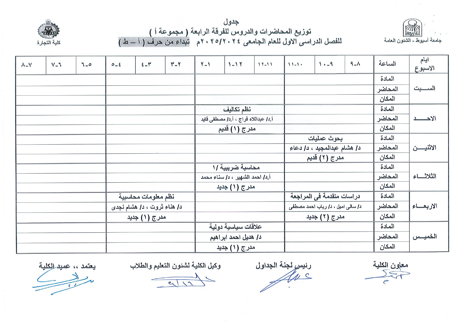 جدول محاضرات الفرقة الرابعة مجموعة (ا)