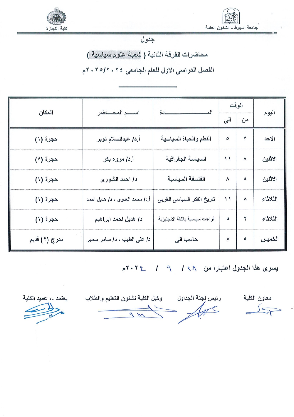 جدول محاضرات الفرقة الثانية (شعبة علوم سياسية)