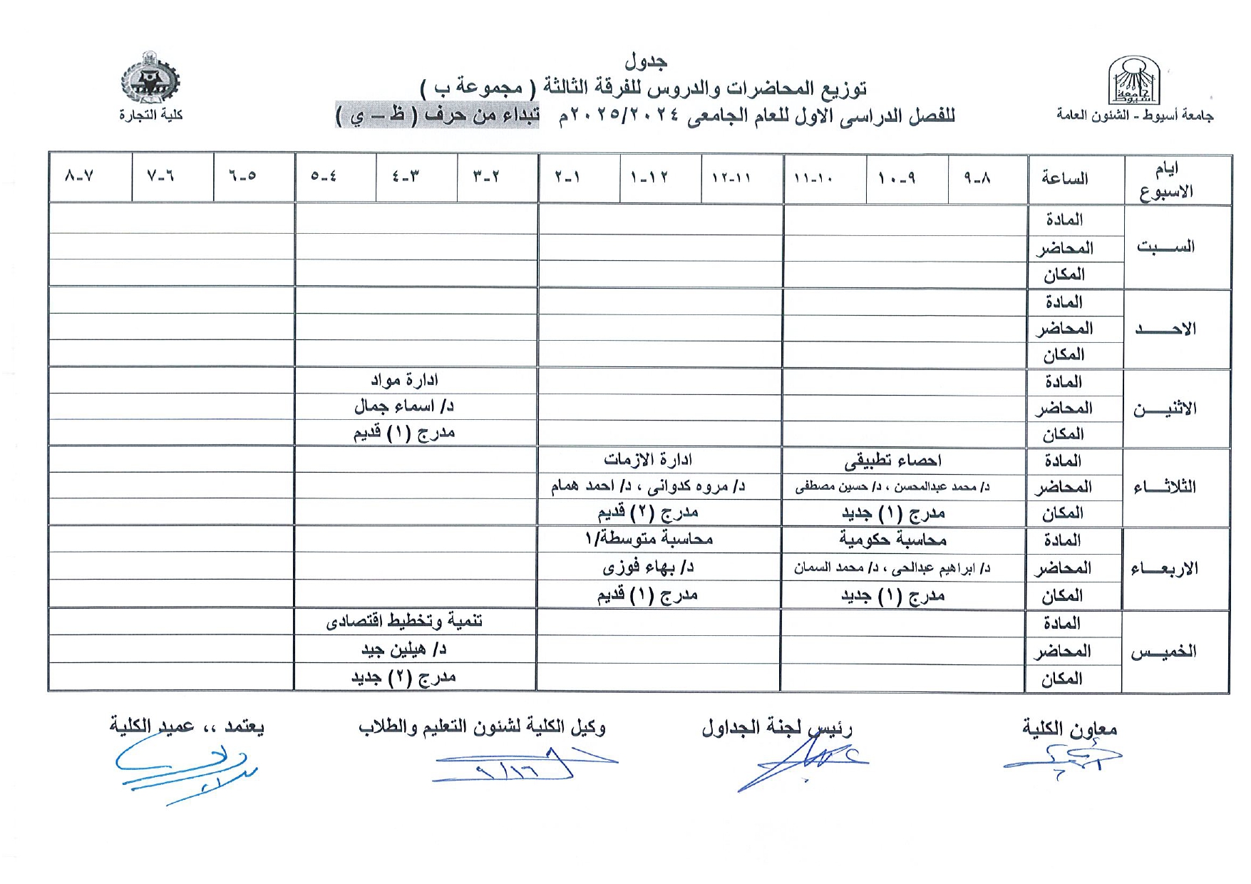 جدول محاضرات الفرقة الثالثة مجموعة (ب)