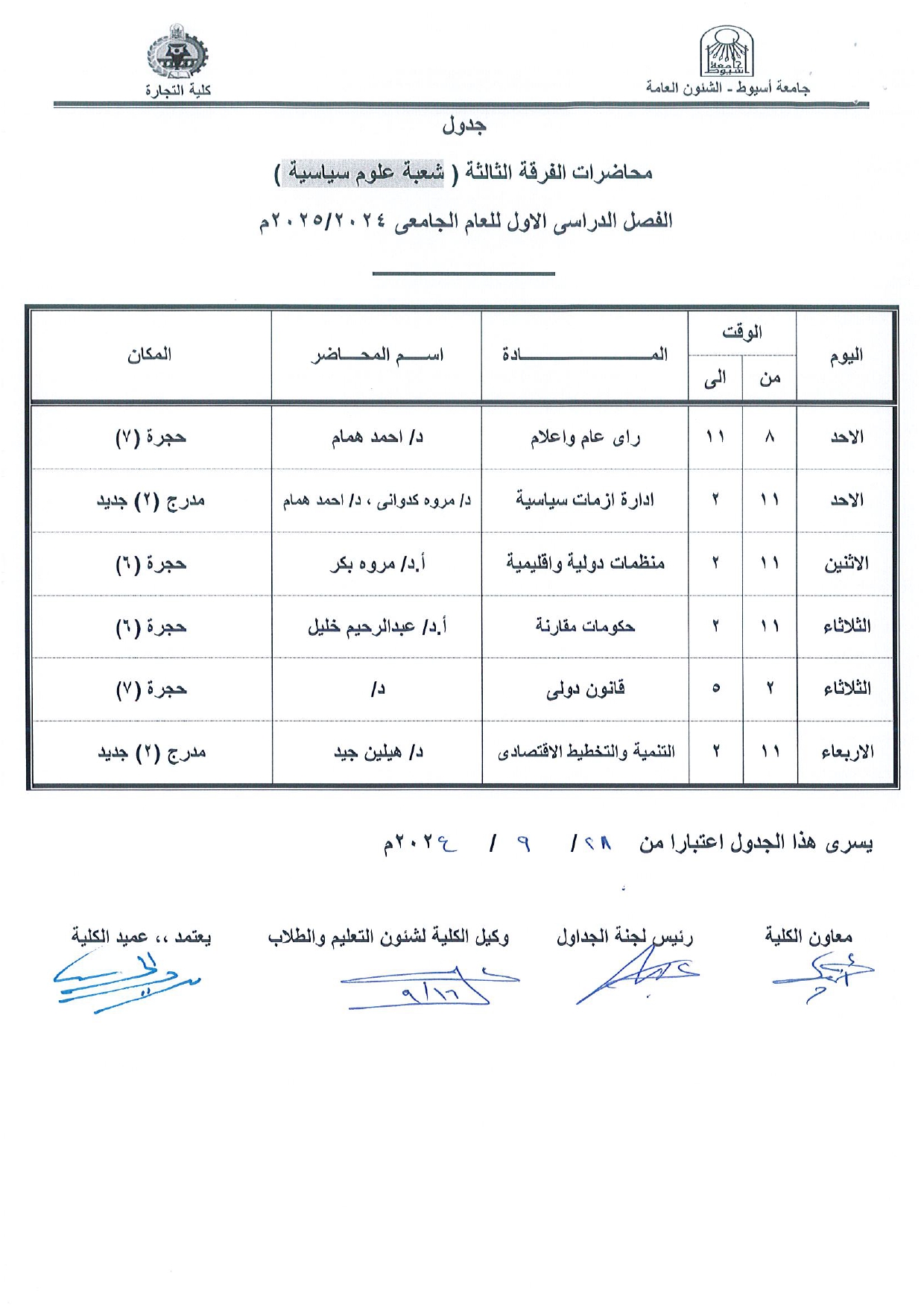 جدول محاضرات الفرقة الثالثة (شعبة علوم سياسية)