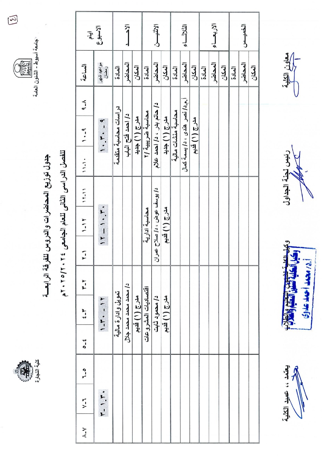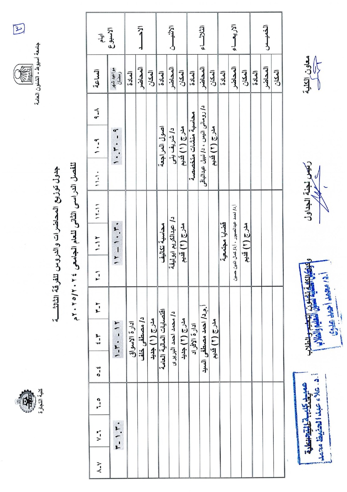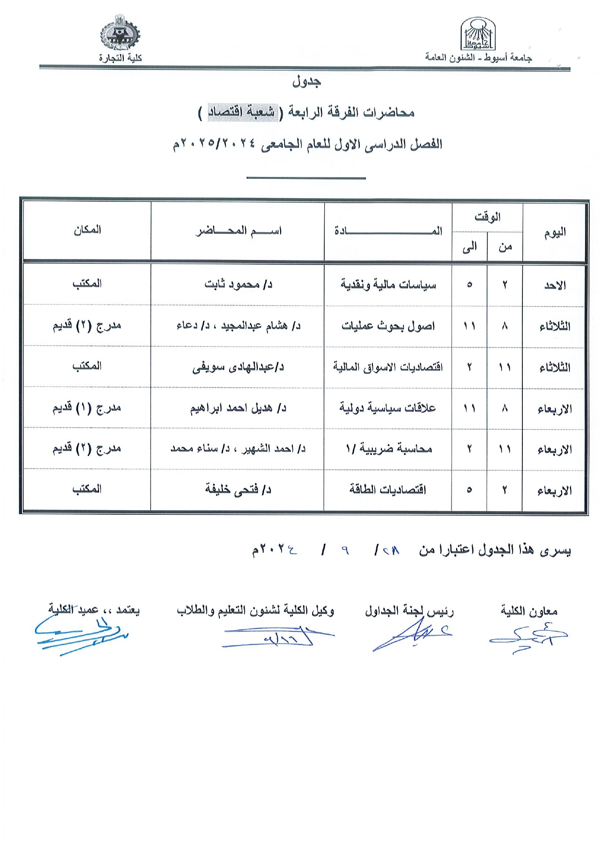 جدول محاضرات الفرقة الرابعة (شعبة إقتصاد)