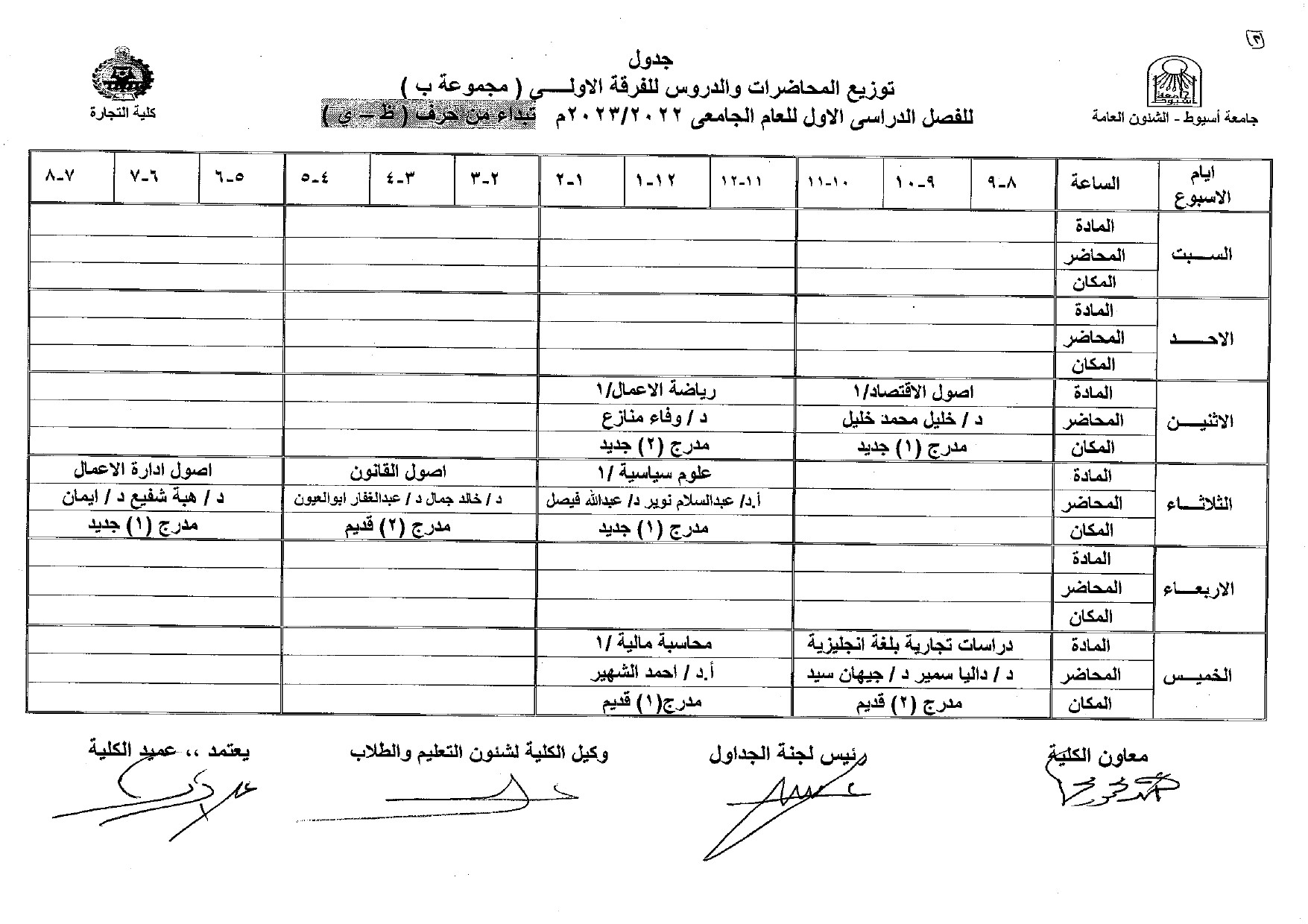 Distribution schedule of lectures for the first year (Group B) first semester for the academic year 2023/2022 26 September 2022
