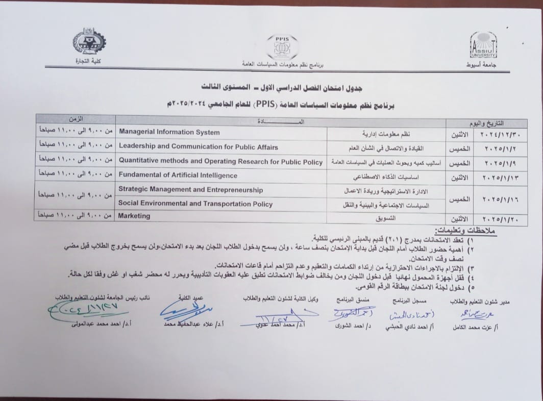 First semester exam schedule for 2024/2025, third level of PPIS program