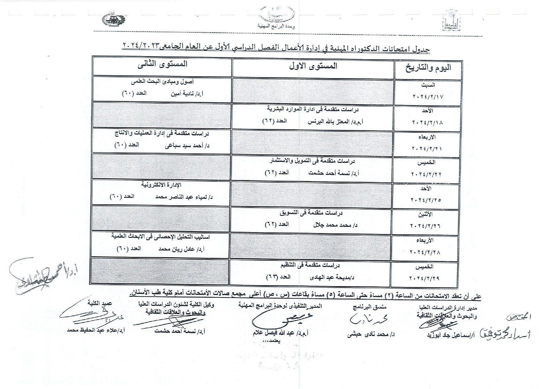 جدول امتحانات الدكتوراه المهنية فى إدارة الاعمال الفصل الدراسى الاول 2024/2023