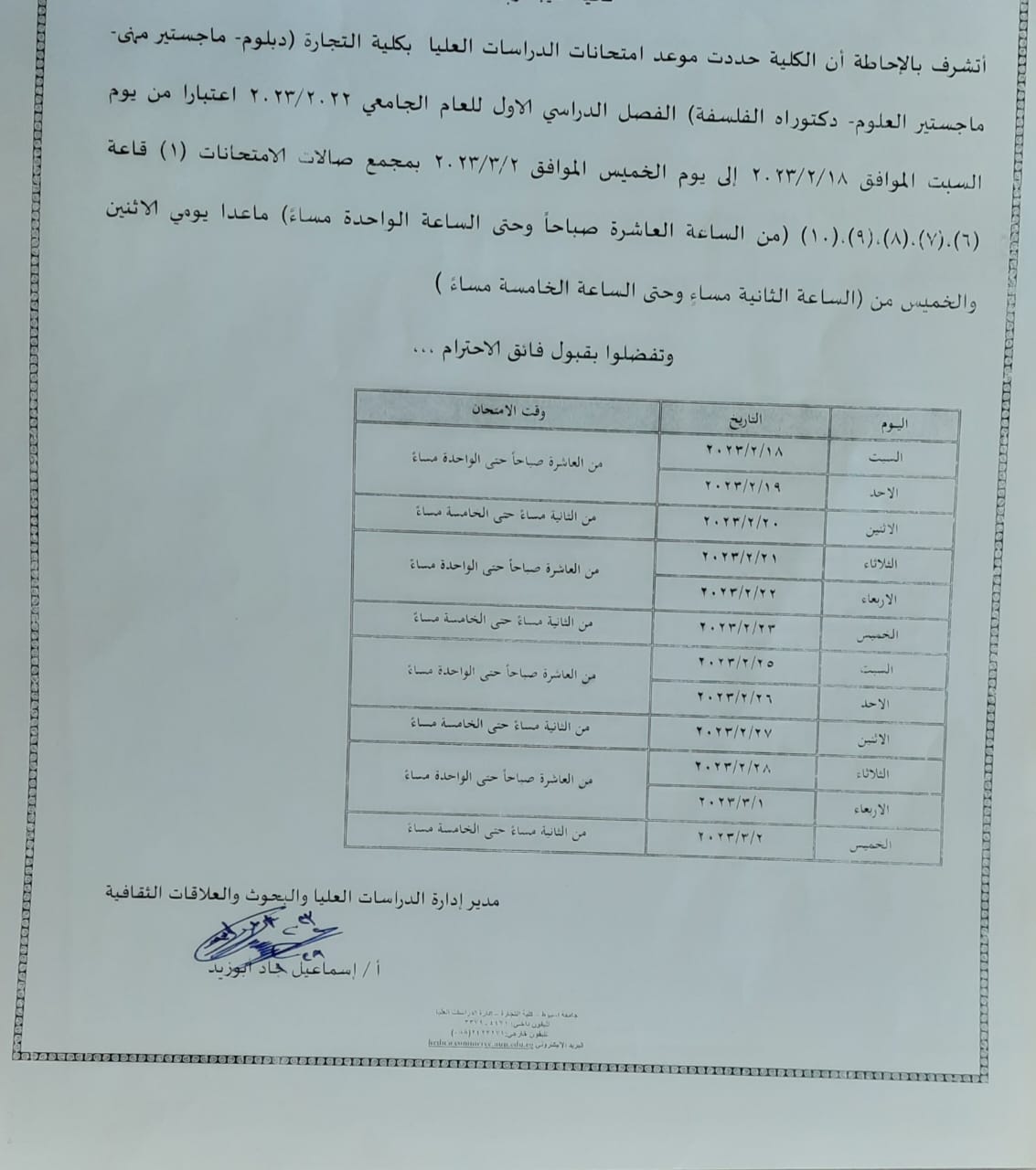 جدول إمتحانات الدراسات العليا