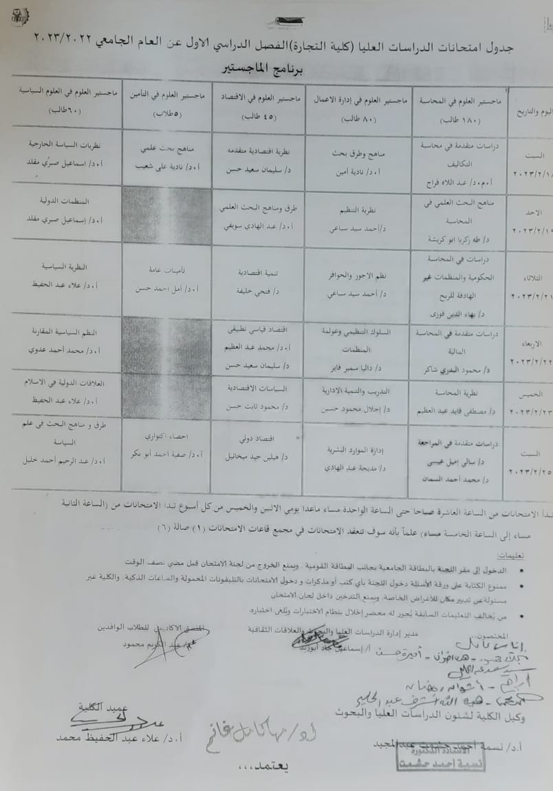 جدول إمتحانات الدراسات العليا الفصل الدراسى الاول برنامج الماجستير