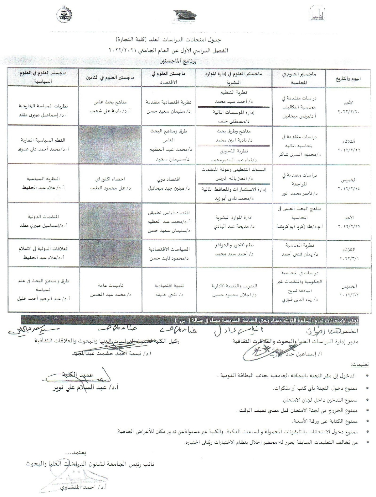 جدول إمتحانات الدراسات العليا -برنامج الماجستير الفصل الدراسي الاول 2022/2021