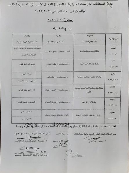 جدول امتحانات الدراسات العليا (كلية التجارة ) الفصل الدراسي الاستثنائي للطلاب الوافدين عن العام الجامعى ٢٠٢٢/٢٠٢١ المقررات التكميلية(معدل) 12 أكتوبر 2022
