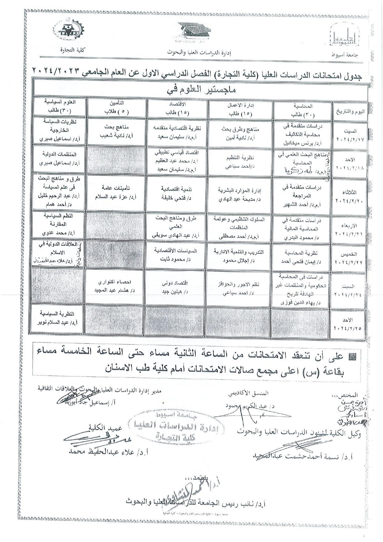 جدول امتحانات الدراسات العليا - كلية التجارة - الفصل الدراسى الاول عن العام الجامعى 2024/2023 برنامج الماجستير 10 فبراير 2024