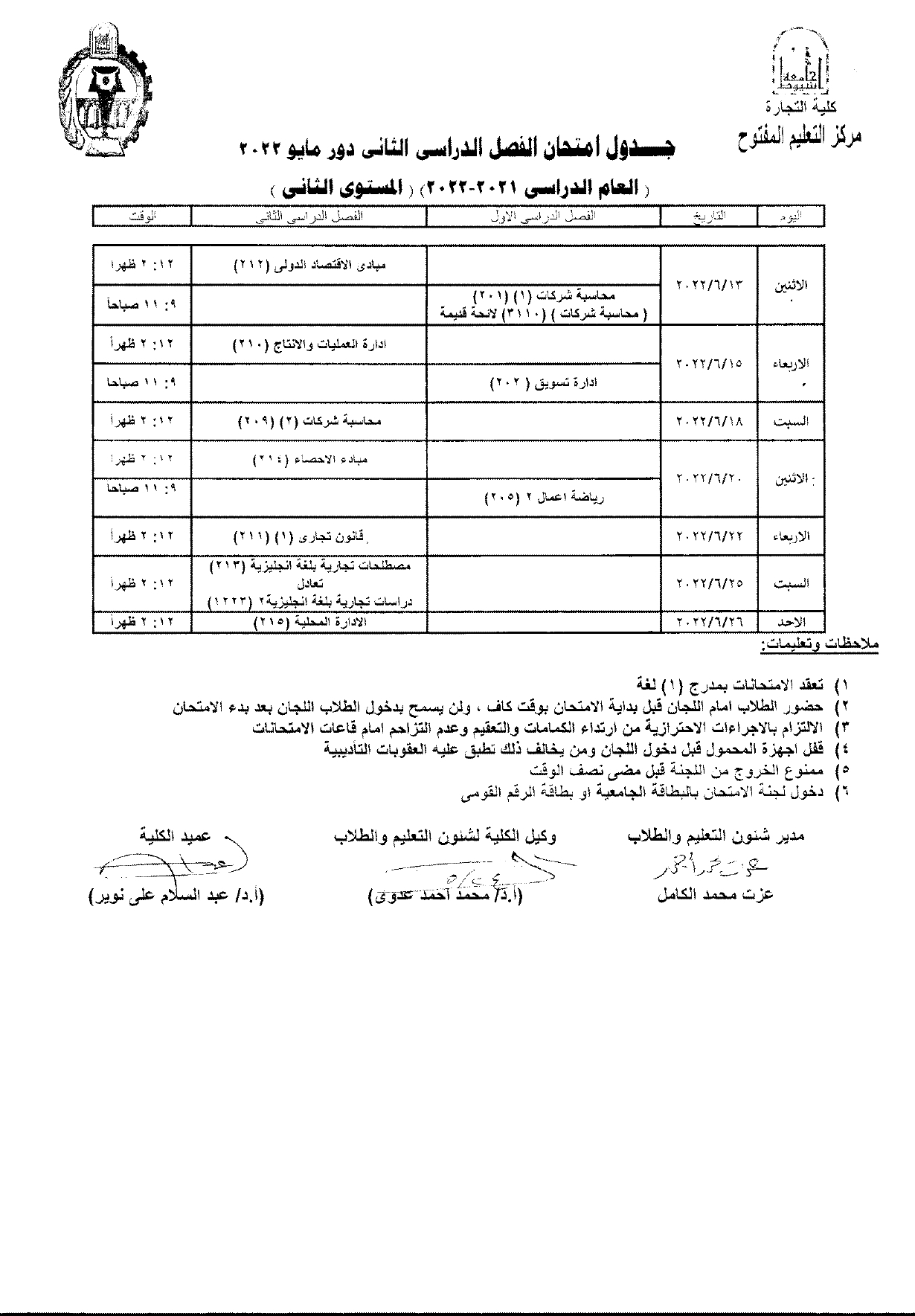 جدول إمتحانات الفصل الدراسى الثانى - المستوى الثانى/ التعليم المفتوح (دور مايو ) للعام الجامعى 2021/2022 28 مايو 2022