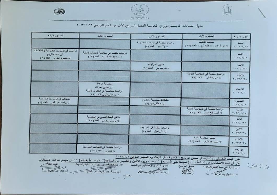جدول إمتحانات الماجستير المهنى فى المحاسبة الفصل الدراسى الاول