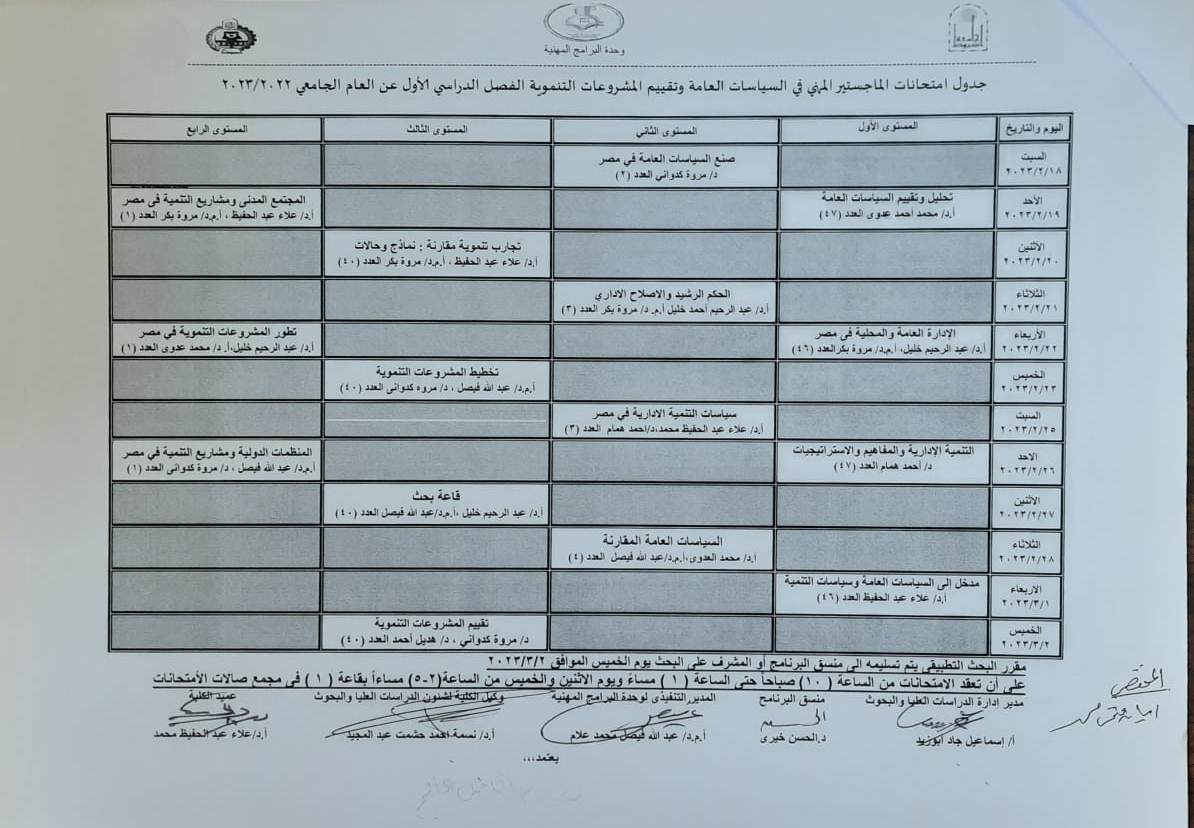 جدول إمتحانات الماجستير المهنى فى السياسات العامة الفصل الدراسى الاول