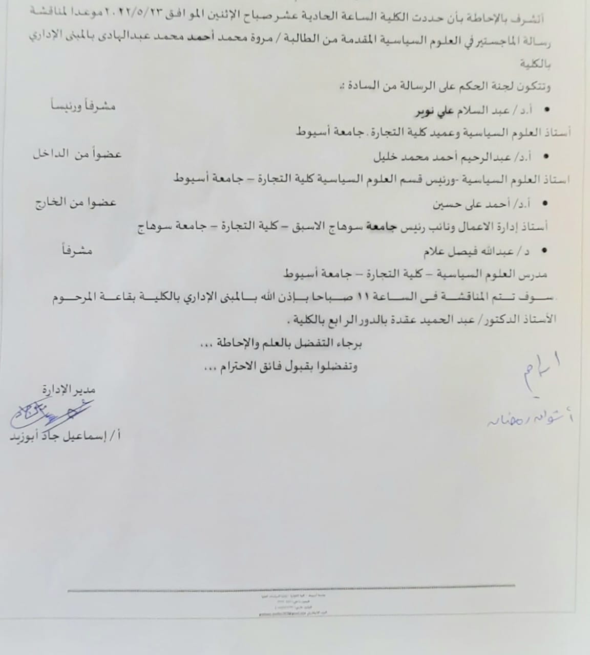 مناقشات 9 مايو 2022 مناقشة رسالة الماجستير في العلوم السيالسية المقدمة من الطالبة/ مروة محمد احمد عبدالهادى