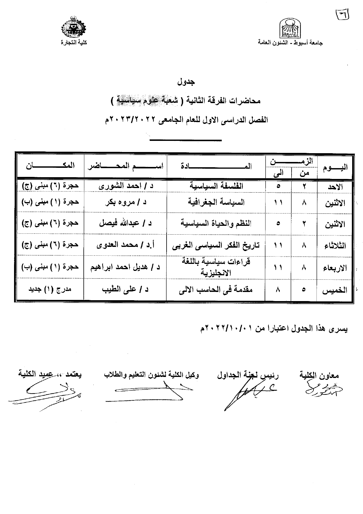 Lectures distribution schedule for the second year (Political Science Division) first semester for the academic year 2023/2022 26 September 2022