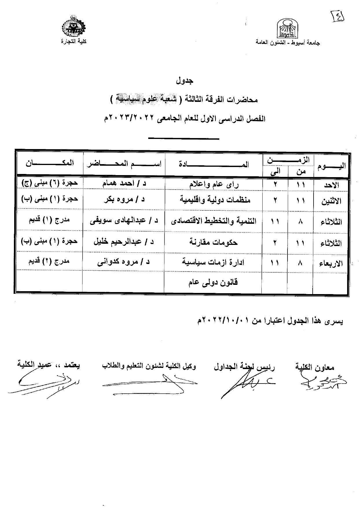 Lectures distribution schedule for the third year (Political Science Division) first semester for the academic year 2023/2022 26 September 2022