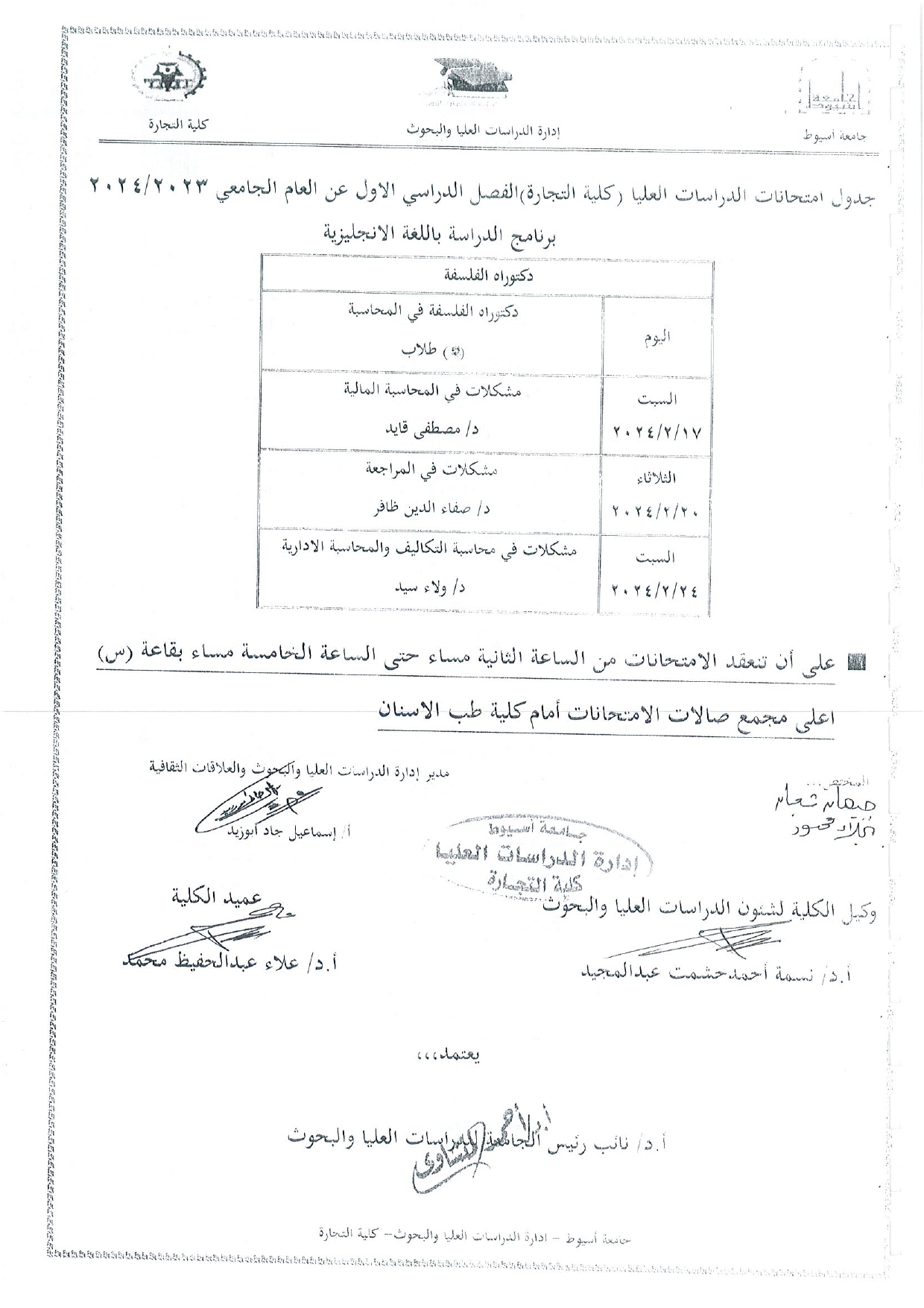 Postgraduate exams schedule - Faculty of Commerce - first semester for the academic year 2023/2024 Study program in English Doctor of Philosophy 10 February 2024