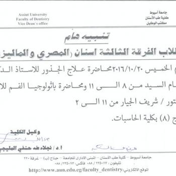 اعلان عن محاضرة للدكتور هاني شريف لطلاب الفرقة الثانية مصري وماليزي الاثنين 17-10-2016