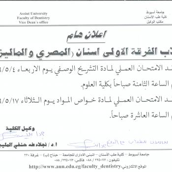 اعلان امتحان العملى لمادة التشريح الوصفي و خواص المواد للفرقة الاولى