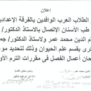 اعلان لطلاب الفرقة الاولي مصري وماليزي
