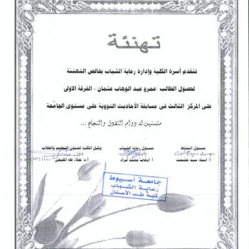 تهنئة للطالب عمرو عبد الوهاب عثمان بالفرقة الاولى