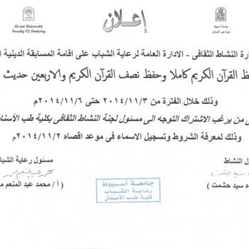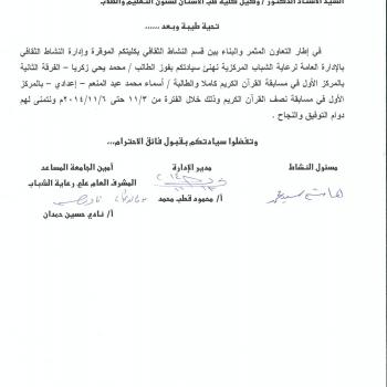 فوز الطالب / محمد يحى زكريا - الفرقة الثانية بالمركز الأول فى مسابقة القرآن الكريم كاملاً
