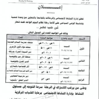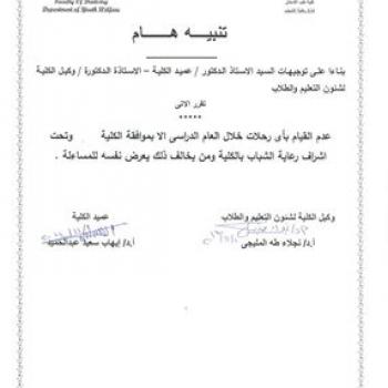بناء على تعليمات السيد الأستاذ الدكتور / عميد الكلية و السيدة الأستاذة الدكتورة / وكيل الكلية لشئون التعليم والطلابتقرر الآتي:عدم القيام بأى رحلات خلال العام الدراسى إلا بموافقة الكلية وتحت إشراف…