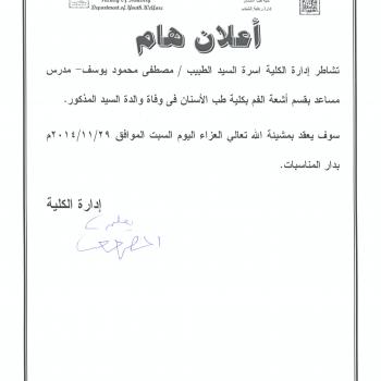 توفيت الى رحمة الله تعالى والدة السيد الطبيب / مصطفى محمود يوسف - مدرس مساعد بقسم أشعة الفم بكلية طب الأسنان - جامعة اسيوط