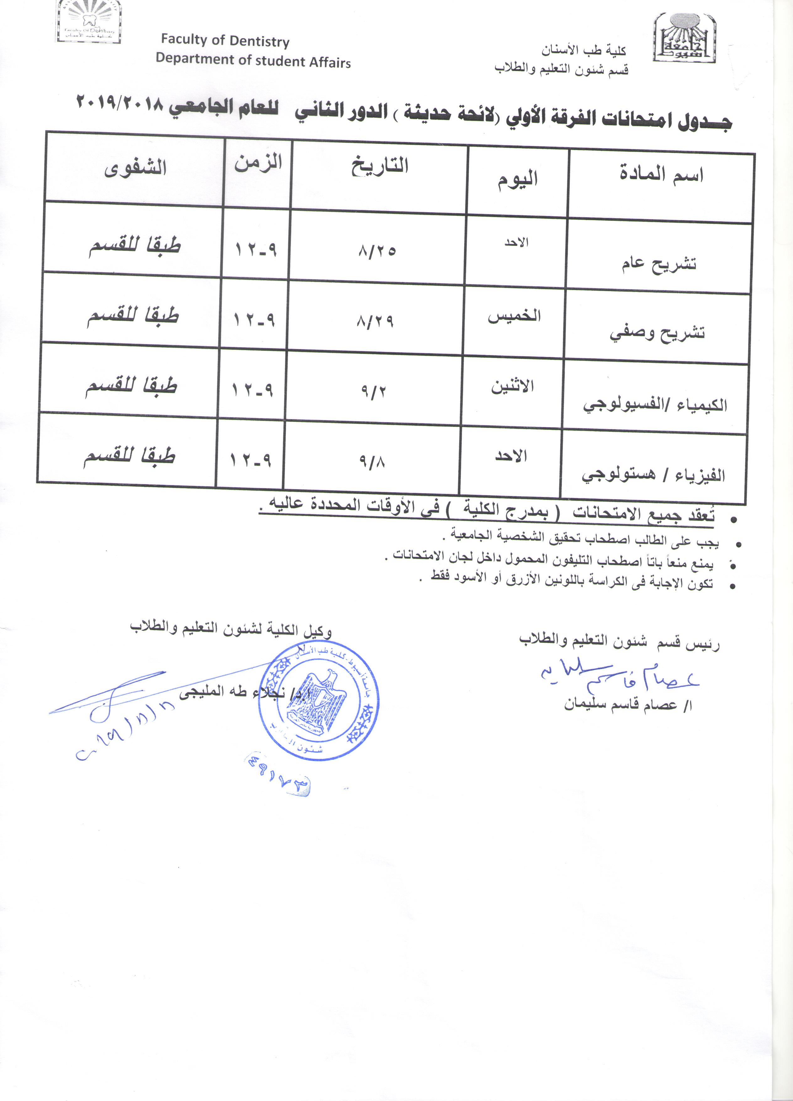 جدول امتحانات الفرقة الاولى لائحة حديث دور ثاني 2019-2018 19 أغسطس 2019 جدول امتحانات الفرقة الاولى لائحة حديث دور ثاني 2019-2018