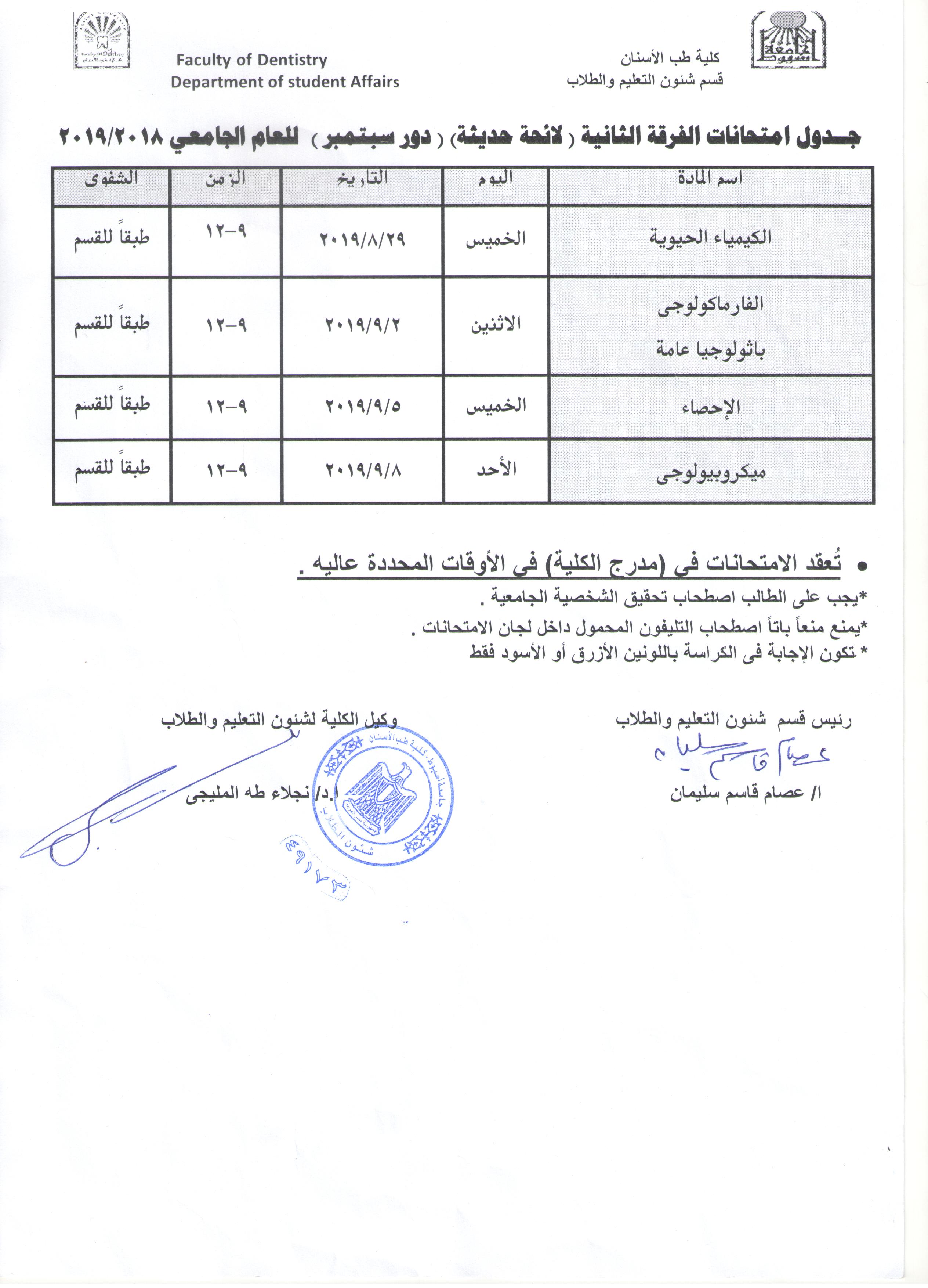 جدول امتحانات الفرقة الثانية لائحة حديث دور سبتمبر 2019-2018 19 أغسطس 2019 جدول امتحانات الفرقة الثانية لائحة حديث دور سبتمبر 2019-2018