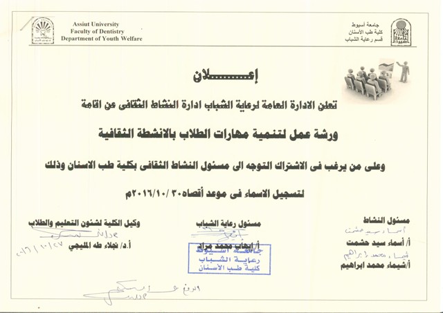 ورشة عمل لتنمية مهارات الطلاب بالانشطة الثقافية 23 أكتوبر 2016 ورشة عمل لتنمية مهارات الطلاب بالانشطة الثقافية