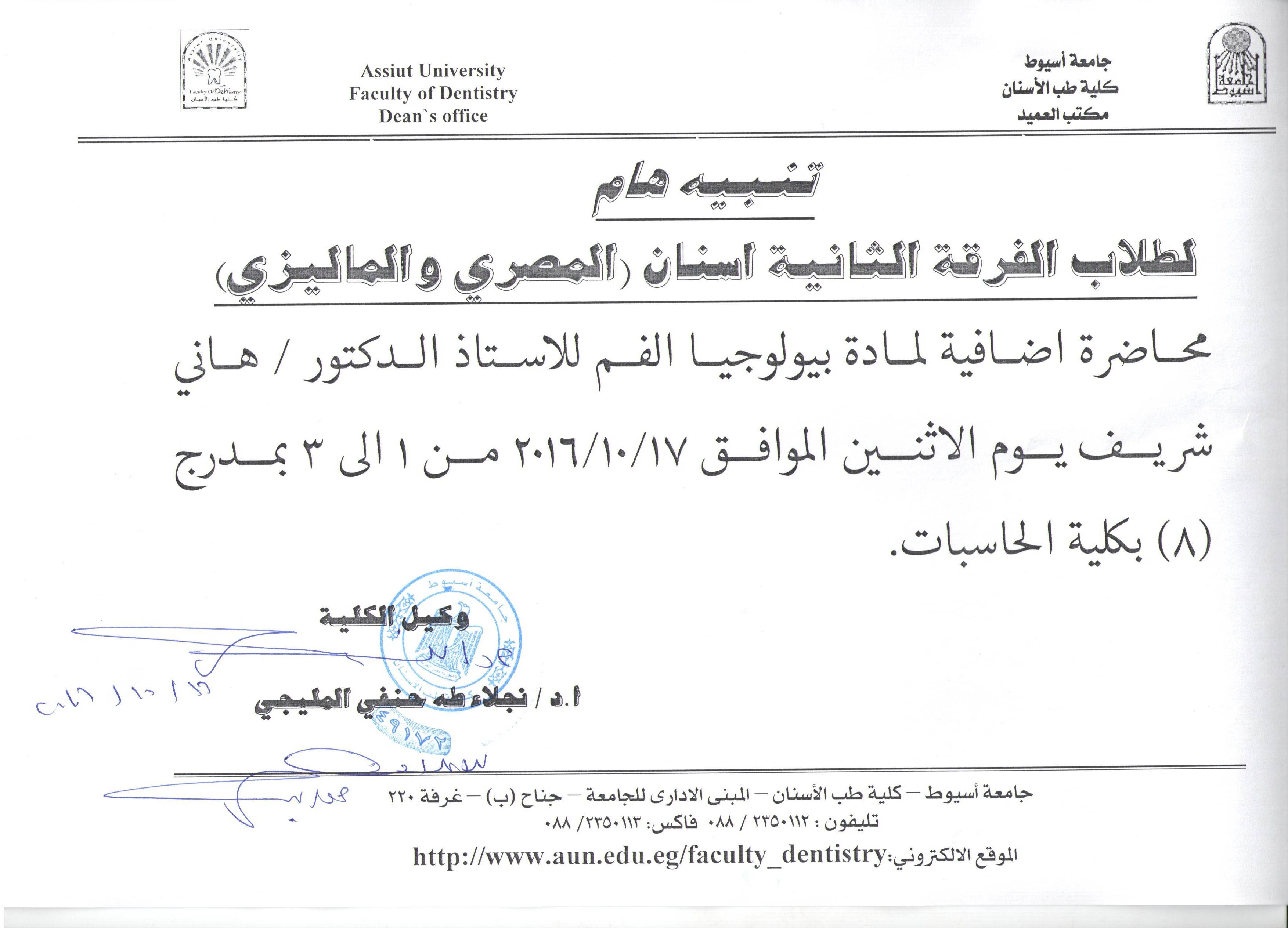 اعلان عن محاضرة للدكتور هاني شريف لطلاب الفرقة الثانية مصري وماليزي الاثنين 17-10-2016 16 أكتوبر 2016 اعلان عن محاضرة للدكتور هاني شريف لطلاب الفرقة الثانية مصري وماليزي الاثنين 17-10-2016