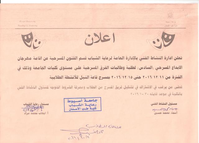 اعلان عن اقامة مهرجان الابداع المسرحى السادس 13 أكتوبر 2016 اعلان عن اقامة مهرجان الابداع المسرحى السادس