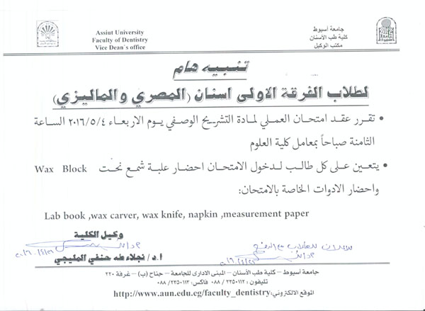 موعد امتحان عملى لمادة تشريح وصفي لفرقة الاولى مصري وماليزي 21 أبريل 2016 موعد امتحان عملى لمادة تشريح وصفي لفرقة الاولى مصري وماليزي