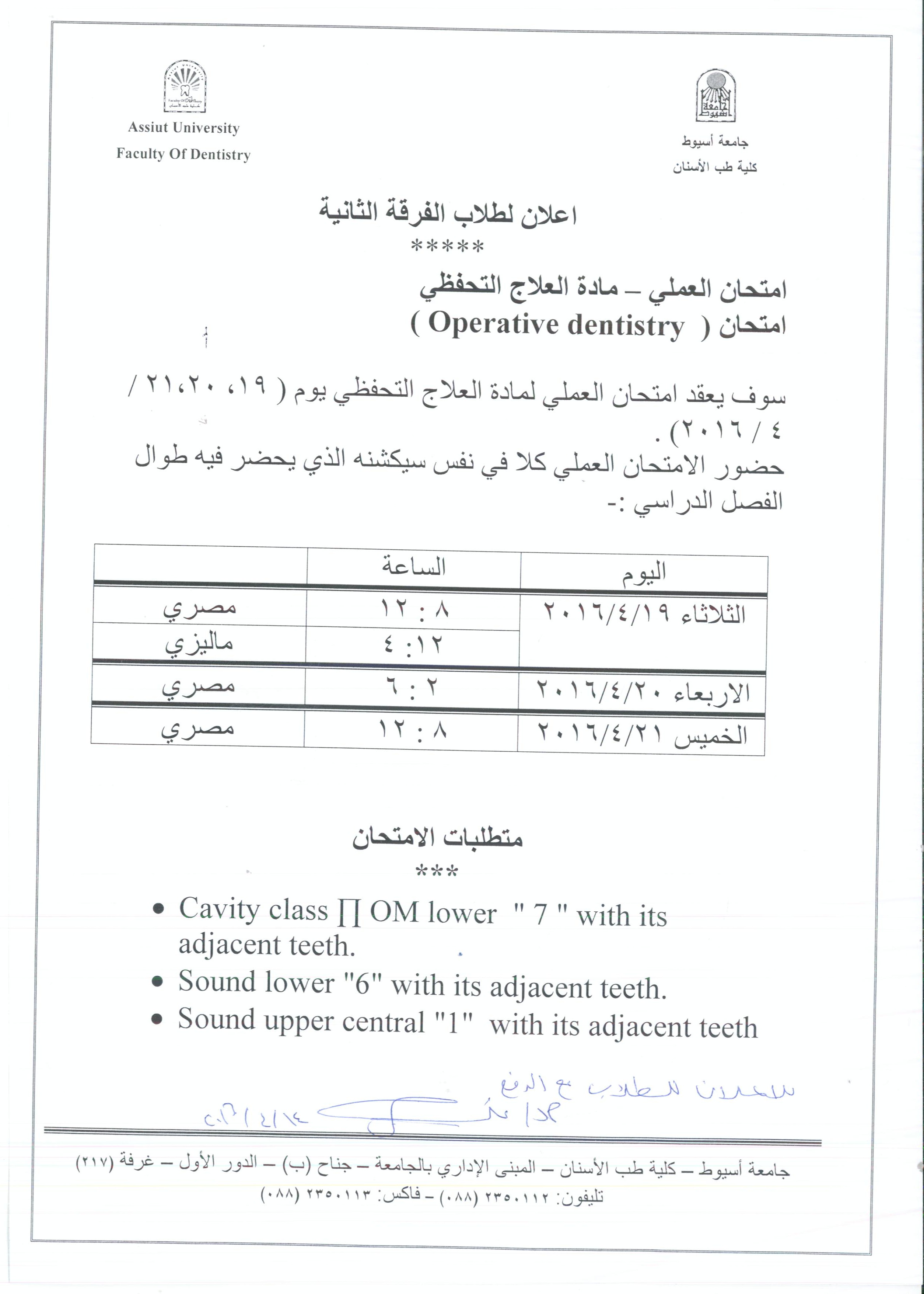 اعلان امتحان العملى لمادة العلاج التحفظي