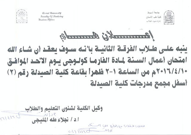 اعلان لطلاب الفرقة الخامسة .