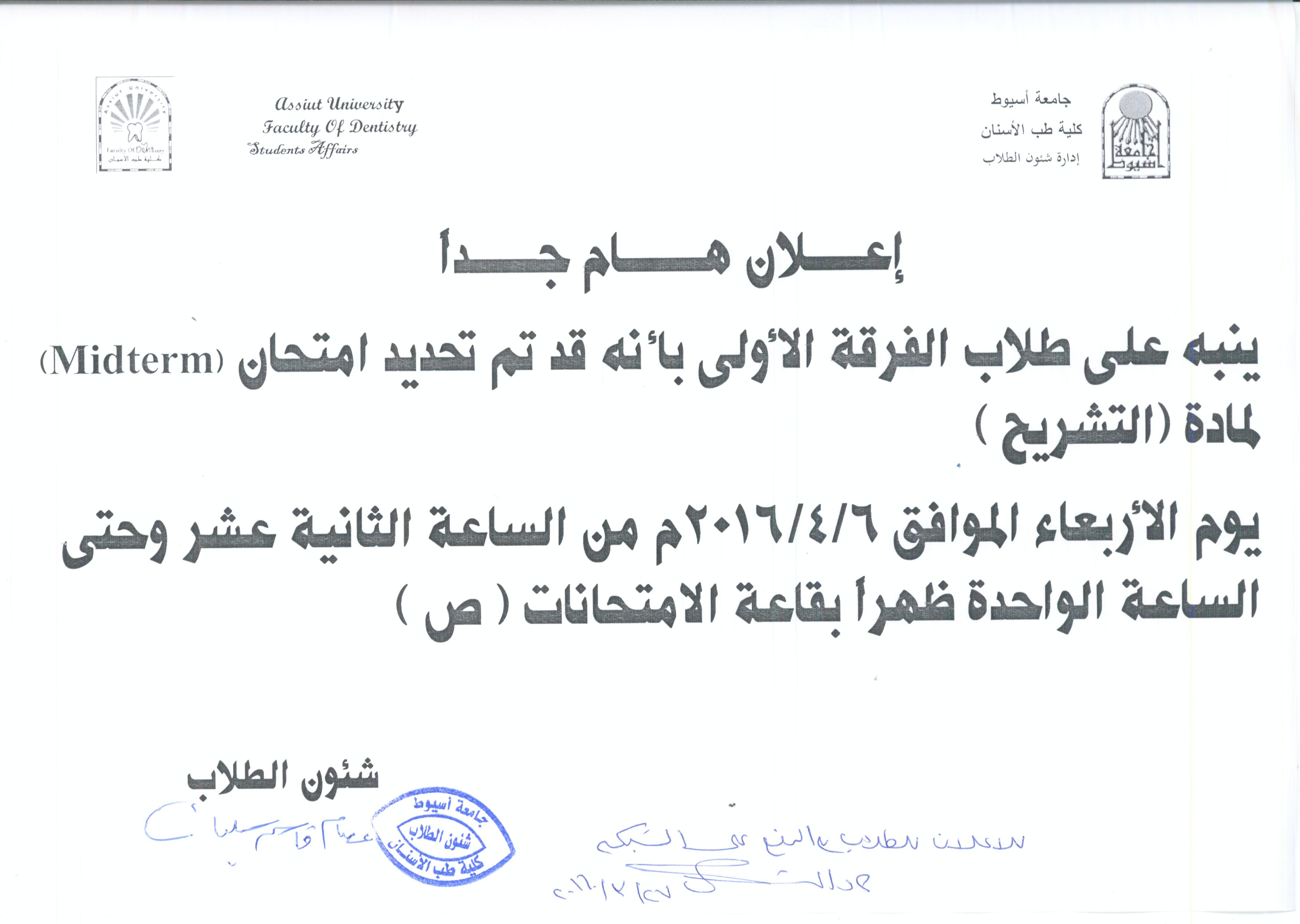 اعلان هام لطلاب الفرقه الاولى بخصوص امتحان ماده التشريح 27 مارس 2016 اعلان هام لطلاب الفرقه الاولى بخصوص امتحان ماده التشريح