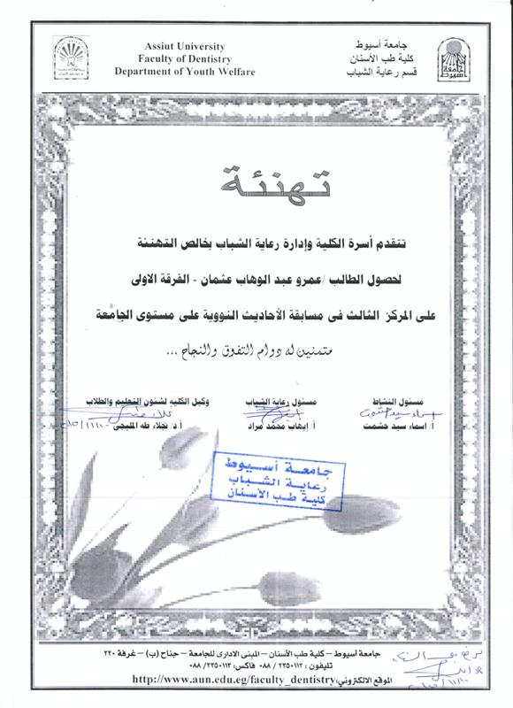 تهنئة للطالب عمرو عبد الوهاب عثمان بالفرقة الاولى 10 نوفمبر 2015 تهنئة للطالب عمرو عبد الوهاب عثمان بالفرقة الاولى
