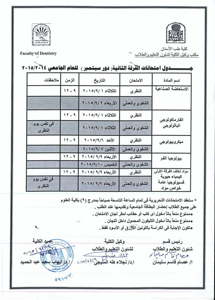 جدول امتحان الفرقة الثانية دور سبتمبر
